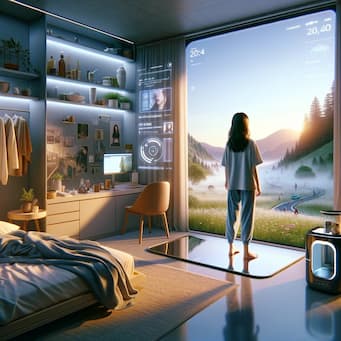 ワンルームのアパートの部屋はまだ段ボール箱でごちゃごちゃしているが、先端技術により、壁全体が大型ディスプレイとして機能し、自然の中で目覚めているかのような体験を提供している。